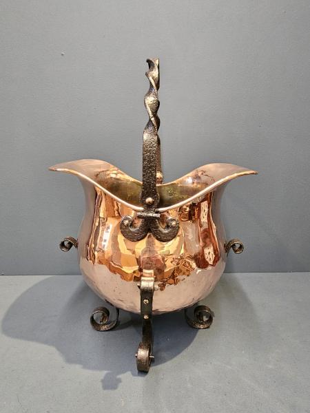 <p>A top quality and stylish Arts & Crafts copper coal scuttle with wrought iron work feet and handle c.1900. Bellied hand beaten copper with flared rims at each side for tipping the coal. Sat on scroll design hand forged wrought iron feet with a matching swing handle design to the top and complimenting fittings secured by copper rivets. Heavy quality and superbly made, presented in excellent condition with a deep shine. Measures 15" wide x 14" deep x 14" high or 20" high with the handle up. Stock number 43154. </p>