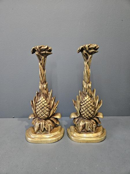 <p>A superb quality matching pair of Regency period cast brass pineapple door stops c.1830. Heavy quality solid cast brass with inset weights to the bases for stability and excellent detail throughout. Moulded lips forming the foot with pineapple above, which is surrounded by leaves and the pineapple crown forming the door stop handle. Both with original rich hand polished finish, presented in superb condition and very heavy. Each measures 6" wide x 3" deep at the base x 13.25" high. Stock number 43212/43094.</p>