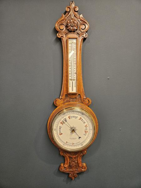 <p>A superb Victorian polished oak banjo barometer and thermometer with porcelain dial by Lloyd Payne & Amiel of Manchester in full working order c.1885. Leaf carved decoration to the solid oak slim proportioned case with leaf and flower crest to the top, turned mount to the dial and a smaller crest at the base to complement the top. Aneriod movement sat behind a porcelain dial with ornate script and coloured lettering to the weather predictions, which are sat around the dial edge. Polished brass bezel with thick bevelled edge glass to the viewing window and centre reading marker sat over the top. The original mercury action thermometer with matching porcelain scale to the barometer dial. Presented in immaculate condition with superb colour and patina to the case; fully serviced and working. Measures 35" long x 10" wide x 3" deep. Stock number 43008.</p>