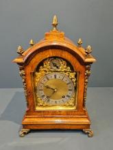 <p>A late Victorian golden oak bracket clock with 8 day ting-tang striking to the quarters and gilded brass and silvered dial c.1890. The solid golden oak case with cushion top and wide moulded cornice below. Glazed hinged door to the face and broad moulded plinth to the base with gilt brass claw feet below. Gilt brass decoration to the case with matching finials to the top. Gilt brass and silvered dial with Roman numerals and blued steel hands, complementing gilt brass spandrels to the corners of the dial. The 8 day movement with anchor escapement and ting-tang striking to the quarters; fully serviced and working. Superb quality and condition with a rich colour and original patina to the case. A short video of the clock striking can be viewed via <a href="http://www.youtube.com/@sturmansantiques1428" target="_blank">our YouTube channel - click here</a>. Measures 9.5" wide x 7" deep x 15" high to top of finial. Stock number 42363.</p>