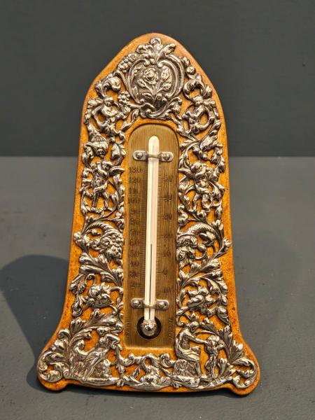 <p>A Victorian desk top thermometer with fretted and embossed silver front sat on an oak back by highly regarded maker William Comyns, hallmarked Birmingham 1891. Shaped oak plinth with sturdy easel stand to the rear, the solid silver thermometer front decorated with an embossed scroll design plus engraved brass thermometer scale set to the centre. Original mercury action thermometer in full working order and sat central to the scale. Bears the makers mark for William Comyns along with clear hallmarks and presented in immaculate condition with a deep shine. Measures 4.25" wide at the base x 6.75" high. Stock number 42321.</p>