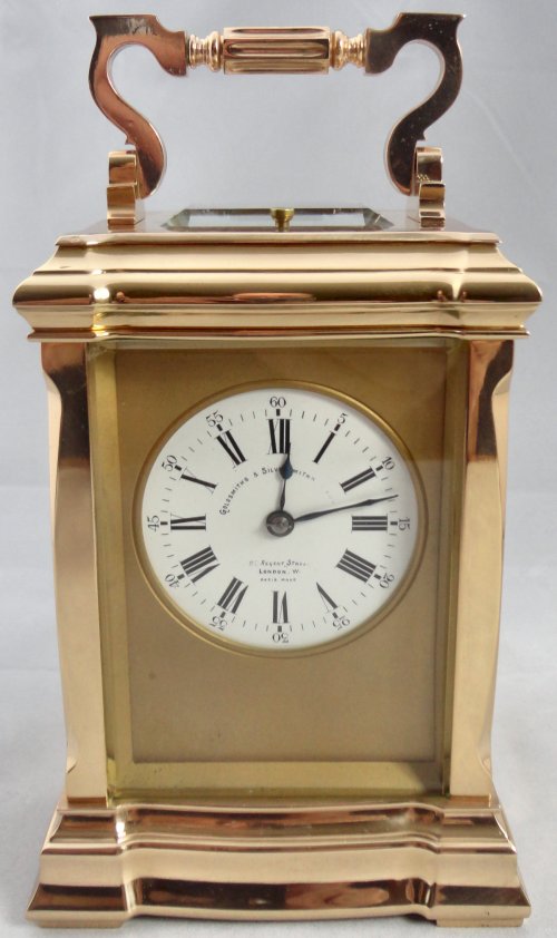 The rectangular case with ogee shaped top and base, enclosed in bevelled glasses.