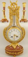 Antique French ormolu lyre clock garniture with swinging paste set pendulum