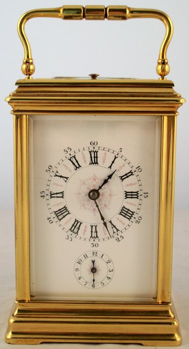 8-Day movement with lever escapement striking the hours and halves on a gong with repeat button and alarm function.