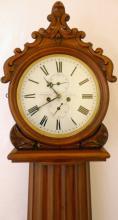 Rare mahogany drumhead case with a fluted column on a five sided base and with a nicely carved hood cresting.