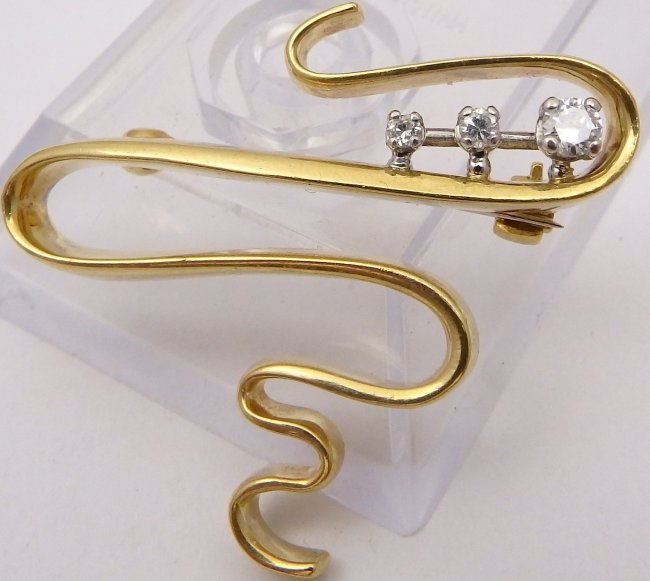 A nice quality yellow gold brooch of scroll form with a white gold pin and locking clasp.