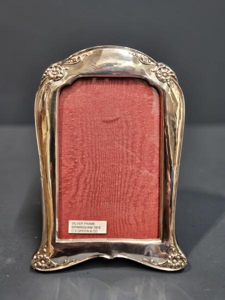<p>A fine quality George V period solid silver photo frame with embossed floral design border, hallmarked Birmingham 1913. The broad silver surround fashioned in the Art Nouveau style embossed floral border running around the outer edge. The silver front returning around the sides to meet the solid oak back with sturdy easel stand. Bears the makers mark for Birmingham silversmiths C S Green & Co along with clear hallmarks. Presented in immaculate condition. Takes photograph 3.5" x 5.75".  Measures overall 5" wide x 8" high. Stock number 40494.</p>