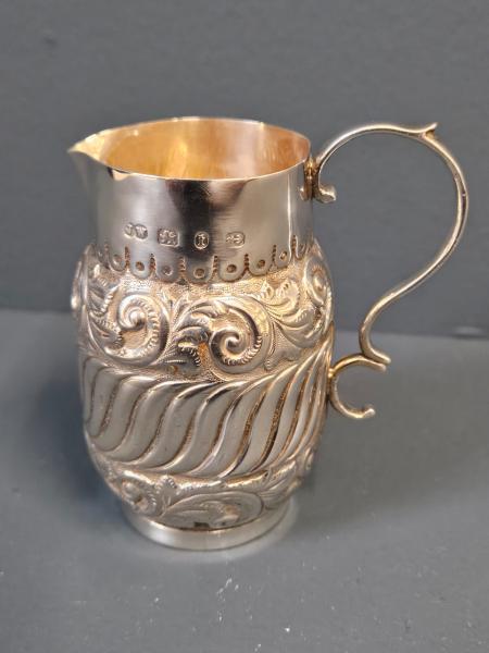 <p>A small fine quality Victorian solid silver cream jug with embossed and engraved decoration, hallmarked Birmingham 1893. The bulbous centre decorated with a continuous band of embossed gadrooned decoration, complemented above and below by engraved and embossed scroll design borders. Deep band to the top with spout set to one side and scroll design handle opposite. Bears the makers mark for Birmingham silversmith John Edward Wilmot along with clear hallmarks. Measures 1.75" diameter vessel x 2.75" wide including handle x 3.25" high. Stock number 41947.</p>