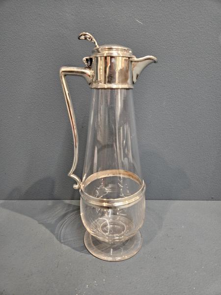 <p>A stylish Victorian silver mounted crystal claret jug in mint condition, hallmarked Sheffield 1872. The slightly tapering plain clear crystal vessel with small pedestal foot to the base. Heavy quality deep solid silver mount to the rim with hinged lid above, plus fretted thumb plate to aid opening and poring spout to the side. Angular silver handle set to the opposite side of the spout with scroll design terminus and supporting silver band running around the vessel, which secures the handle in place. Bears the makers mark for Sheffield silversmiths W & G Sissons along with clear hallmarks to all sections. Presented in immaculate perfect condition. Measures 4" vessel diameter x 5" wide including handle x 11.5" high. Stock number 42682.</p>