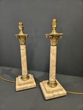 <p>A matching pair of late Victorian marble table lamps with brass Corinthian mounts, fully rewired ready for use c.1900. Each matching lamp with off white veined marble stepped bases, brass mount above supporting the matching circular columns. Gilt brass Corinthian mounts to the top of each with switched brass lamp holders above. Both lamps fully rewired with gold covered flex, inline switch and fitted plug. Superb quality and both presented in excellent condition. Each measures 5.75" wide x 5.75" deep at the base x 19.25" high to top of the lamp holder. Stock number 43124.</p>