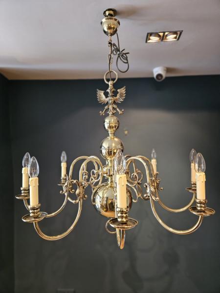 <p>A superb large Edwardian eight arm solid brass chandelier, fully restored and rewired ready for use c.1910. The eight arms each with swept wide span, scroll design decoration to the internal ends and broad sconce to the ends supporting the candle style lamp holders. The turned centre with large polished sphere to the base and ring below. Hanging loop to the top supporting the adjustable length of chain with original cup design ceiling mount to the end. Fully rewired with new lamp holders taking SES bulbs and 1 meter of extra flex for lower hanging. Presented in immaculate condition with a deep shine.  Measures 35" diameter  x 35" deep (excluding chain and ceiling rose). Stock number 42909.</p>