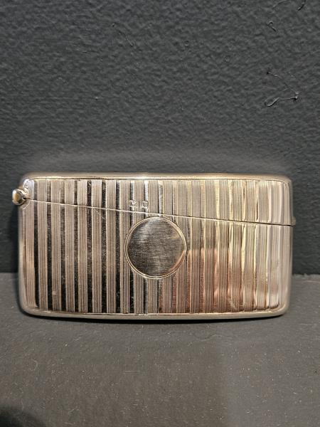 <p>An unusual George V period curved card case with engine turned finish, hallmarked Birmingham 1920. Slim carved form for comfort in the pocket, striped engine turned finish to both sides. The snap closing lid cut diagonally across, opens to reveal an unused gilt lined interior. Bears the makers for William Neale & Sons Ltd. Presented in immaculate condition with a deep shine. Measures 3.25" wide x 1.75" high x 0.25" deep. Stock number 37655.</p>